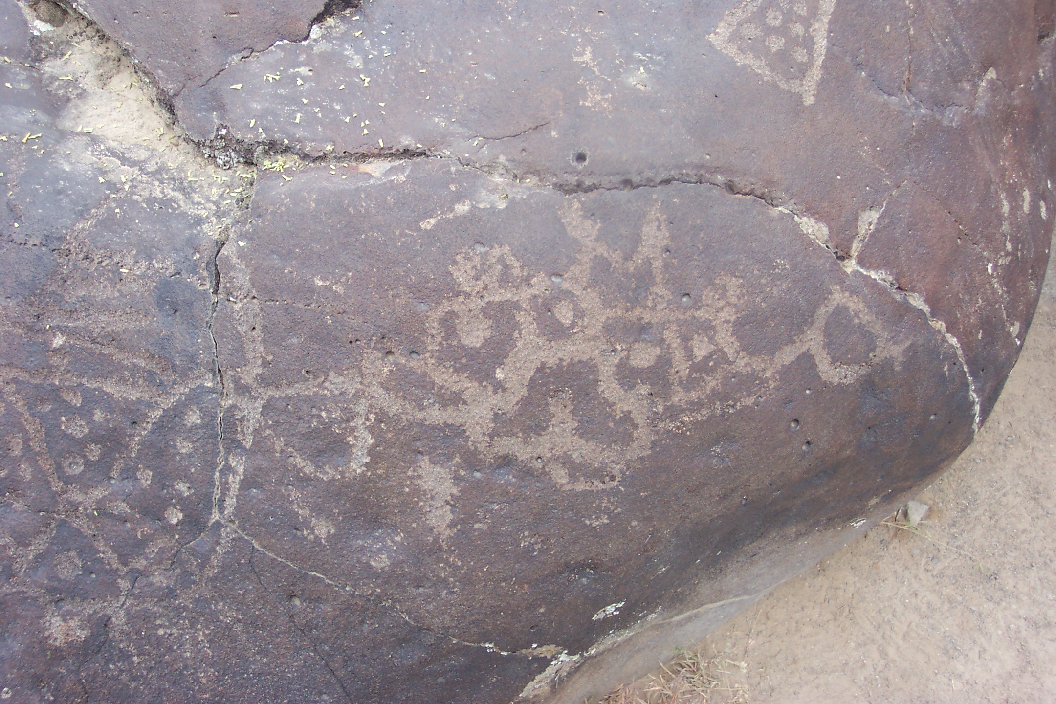 | Preparation: Day began at 6 AM so that we could arrive at 8:30. Celebration Park is 45 minutes from Boise. We parked next to the museum and waited for others to arrive. John Ausberger and I had scouted the place and I showed Blue Thunder the only place I knew of any petroglyphs. We wandered a bit, then Blue Thunder, as if having something brought to memory, said " the wolf will lead you"...then he asked my white wolf to show us the place of ceremony. Now my white wolf Dagnee is a 10 year old domestocate. He prefers sleeping on the couch to sleeping even on the carpeted floor. I wondered how much "wolf" was still in him. However on occasion, I had seen an exquisite understanding that is more present in a person than a wolf. One morning, I did ceremony at home. I went out in the morning at daybreak, built a sacred fire and began. When I was finished with my tobacco prayers and went to put these prayers into the fire, I hear one of those long authentic howls that sends chills up your spine. Dagen was laying 100 feet away. One howl .That was it with perfect timing as I finished the ceremony. Another time, we visited a Brazilian temple in California at my good friends, Andree Morgana. During a healing ceremony, he was asked to join, so he got up from his laying in the corner and joined the circle. He came into the woman encircled and sneezed on her three times. Seems in that tradition that to get rid of negative energy, one sneezes three times.. They thought him magnificent. When the ceremony was over he left the circle of his own accord and laid down in his own spot. Several women said they saw an Eagle bonnet of feathers on him. Amazing I thought. I participated in 3 ceremonies at the Temple. Each time Dagen was asked to join, he did so. Each time he did something just like he was some ancient Shaman. Dagen is a pup birthed by my mated set of Otiunie (Wolf) and Gigagho (Ancient One) both of whom are running free in the Happy Hunting Ground. His name means second in Oneida. When he was 3 months old, my husband ran over him with the Lincoln Continental. The pup was lodged between the oil pan and a lump in the driveway. I had to crawl under the car and grab a foot and pull his lifeless body out. I cradled him in my arms and sobbed. and sobbed... then I got a little wet kiss. .... Later, my husband made me give him away. After three days of me crying, he told me to get the pup.... and so Dagen has been with me ever since. He is the care taker, the protector. He loves babies. When his mate died with 3 day old pups. we took the sickly pups in the house. He shoved through the door to get to his pups. When he had inspected each one, he laid down beside them and took care of them. He and his half sister Teakanea (Heart Stealer) saved those cubs. In 2003, he and our new female wolf, Honey Moon, gave birth to pups. Honey was new to this and tho she produced and fed fat healthy pups but she was too young to be a mother. Dagen took care of the pups. He was there at birthing, and he stayed with them when Honey was not which was most of the time. Even when his mother birthed pups, most of the photos I have are with Dagen and the latest batch of pups. He is the Peacemaker. He is the Beta. So when Blue Thunder asks him to find our ceremony spot, I have no idea if Dagen has any clue. But he stood for a few minutes.... perhaps to hear the wind tell him where..... perhaps wondering "Who me?"..... I don't know which but then he headed down the trail, went a few yards, stopped and turned around to see if we were following, those yellow gold eyes piercing at 100 yards. Then when he was assured we were following, he trotted on, only after some distance, stopping and looking at us with those incredible eyes. Again assured we were following, he trotted on. This happened probably 6 times. I was beginning to think we were just playing follow the leader when Blue Thunder noticed we had entered a circle of rocks with petroglyphs. Blue Thunder began to read the drawings and in a short time, had deciphered many symbols that talked of vortexes and ceremony under a moon just like the one in the sky last night. This is the place. I looked to see what Dagen was doing, and he had lost interest in our following him and was out watering the sagebrush.
